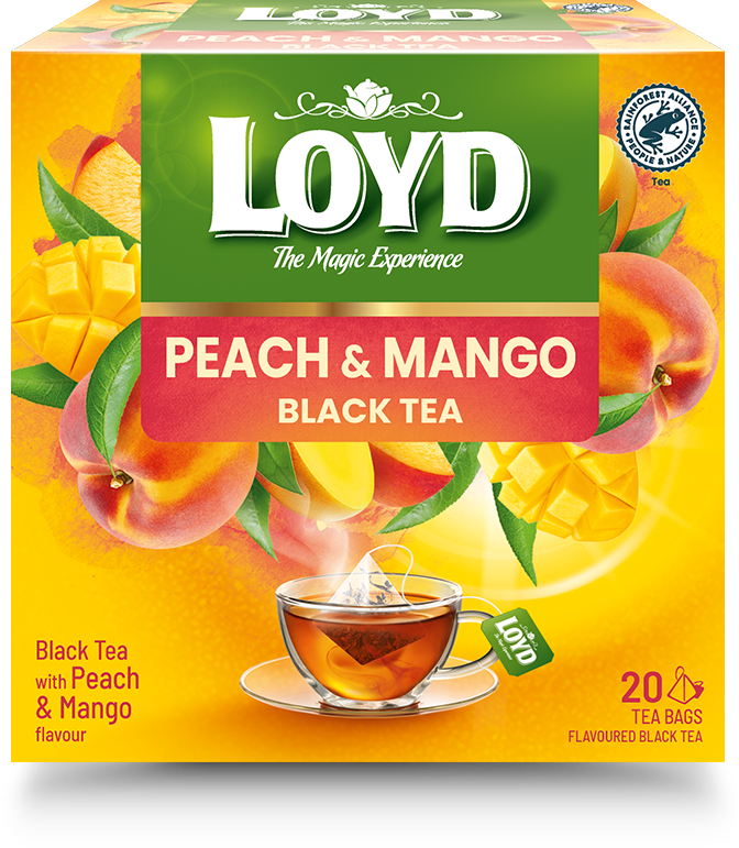 Sākums Pārtikas produkti un dāvanu komplekti Tēja Melnā tēja Aromatizēta melnā tēja LOYD ar mango un persiku garšu 20×1,8g (maisiņos)