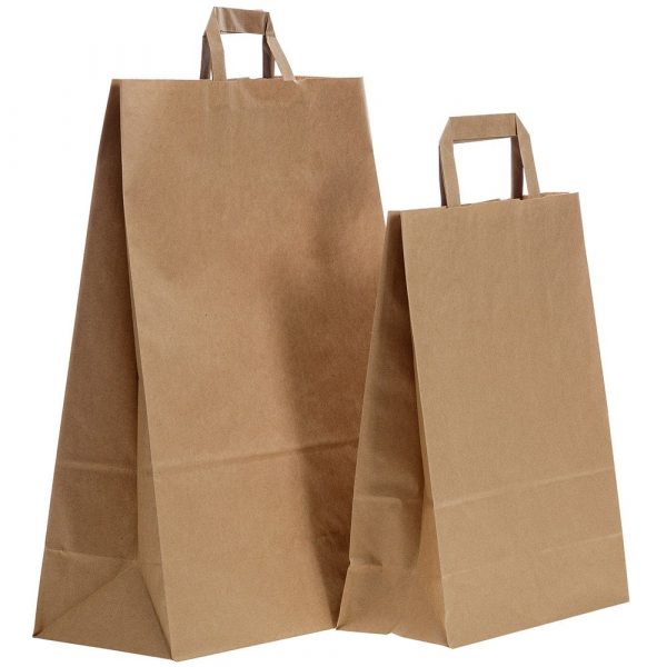 Plakans maisiņš izgatavots no brūna pārstrādāta kraftpapīra. Maisiņš ar papīra rokturiem. Šis maisiņš ir lieliska un ērta izvēle produktu vai