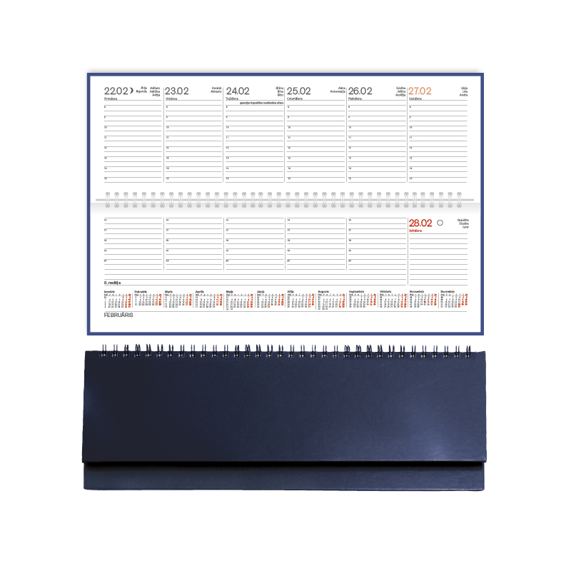 • izmērs: 300mm x 100mm • viena nedēļa atvērumā • FSC sertificēts papīrs, • miradur vāki, iesiets ar spirāli •
