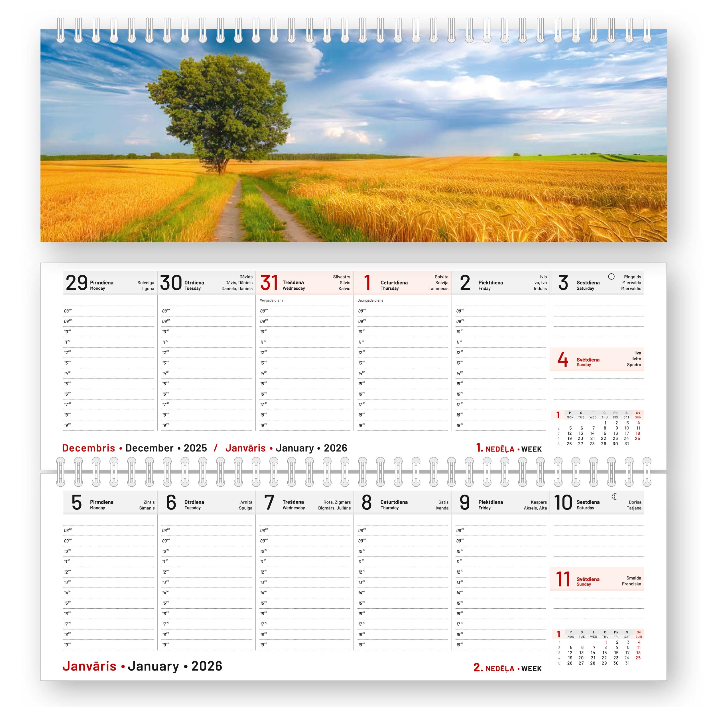 • Pārliekamais galda kalendārs • atvērumā – 1 nedēļa • sastiprināts ar metāla spirāli • izmērs 338 x 100 mm