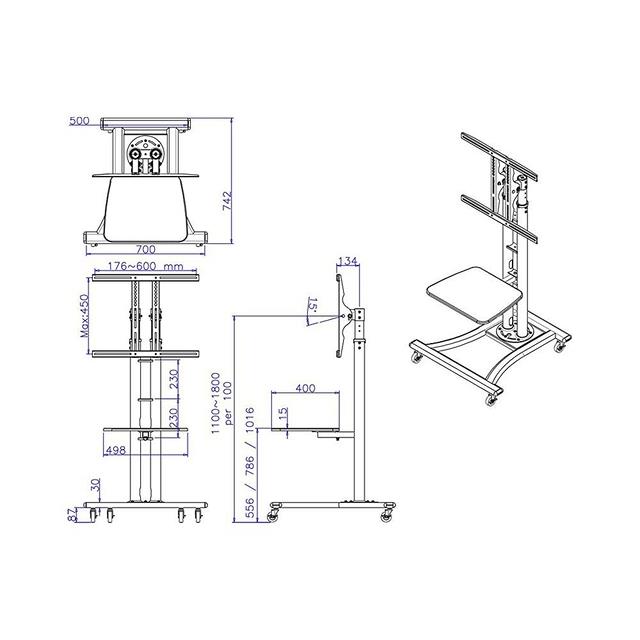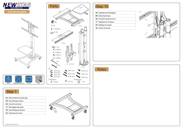 The Neomounts by Newstar floor stand, model PLASMA-M1800E is a mobile floor stand for flat screens up to 70" (178 cm). This mobile stand is a great choice for space saving placement or when wall-, ceiling mounting or desk placement is not an option. This cart stretches your investment by serving a variety of projection needs by sharing a large display over multiple rooms. Get optimal positioning for both standing and seated audiences, in any application, in any part of your location. Neomounts by Newstar's versatile tilt (15°) technology allows the mount to change to any viewing angle to fully benefit from the capabilities of the flat screen. The mount is manually height adjustable from 110 to 180 centimetres. An innovative cable management conceals and routes cables from mount to flat screen. Hide your cables to keep the stand nice and tidy. Neomounts by Newstars' floor stand, PLASMA-M1800E holds your TV, AV equipment and even hides your cables. The casters allow the stand to move it to where you need it. Easily roll this cart through doorways and over thresholds. Neomounts by Newstar PLASMA-M1800E has one pivot point and is suitable for screens up to 70" (178 cm). The weight capacity of this product is 50 kg each screen. The stand is suitable for screens that meet VESA hole pattern 200×200 to 600x450mm. Different hole patterns can be covered using Neomounts by Newstar VESA adapter plates. Speedy assembly and installation. All installation material is included with the product.